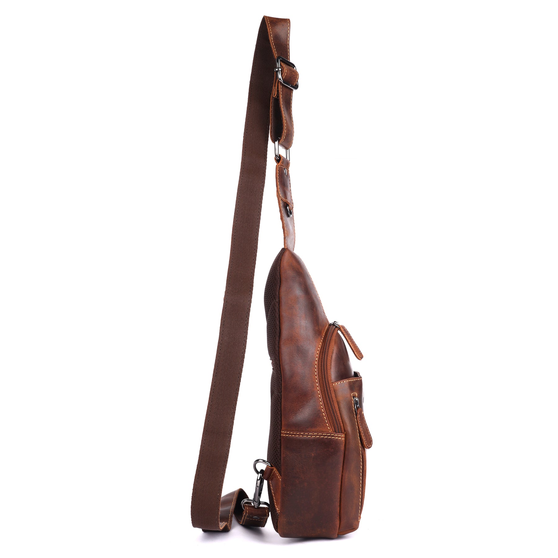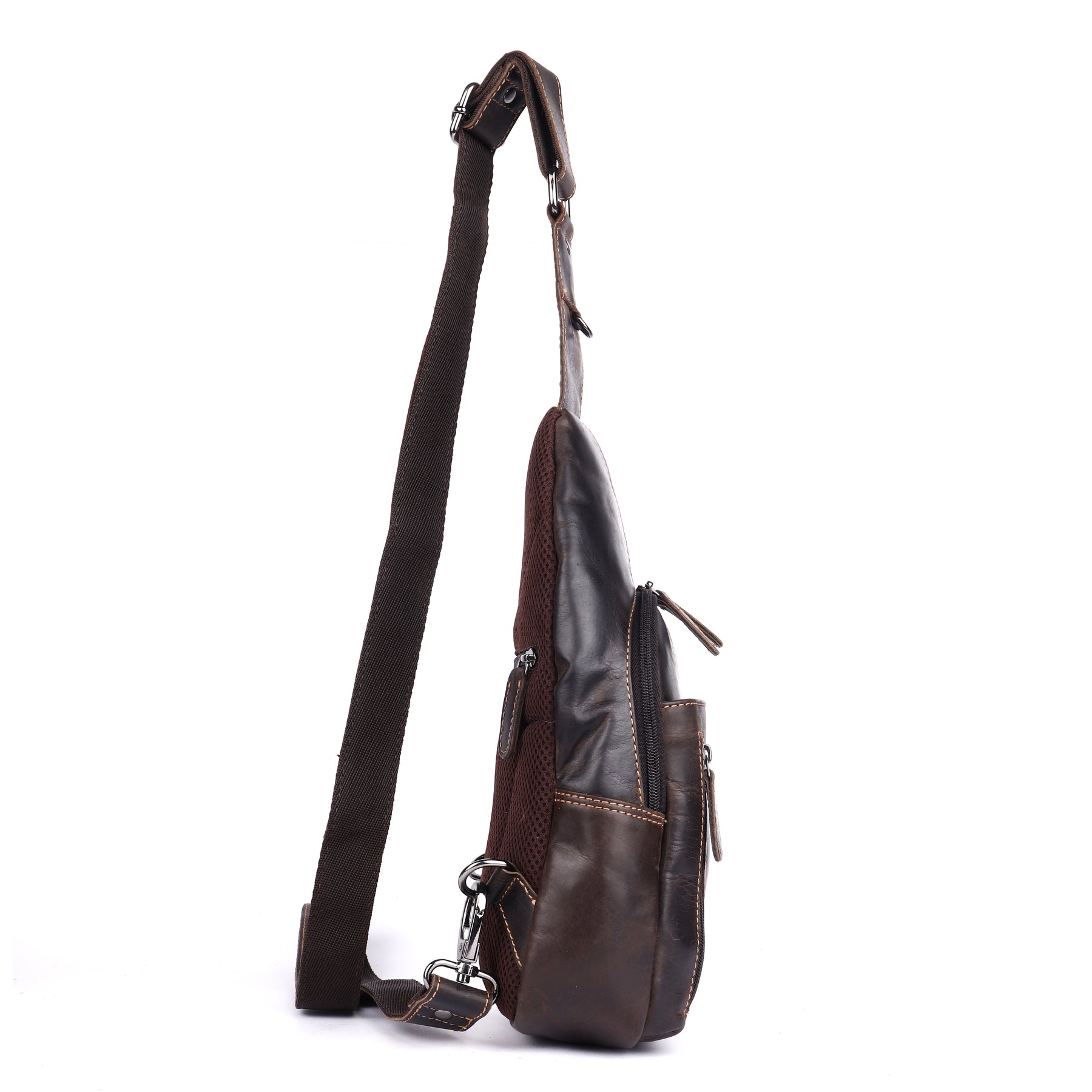 The secure zip main compartment protects your belongings. The front vertical zip pocket allows quick access to frequently used items. A breathable perforated back panel improves airflow and comfort during extended wear. The adjustable strap with reinforced leather shoulder support ensures balanced weight distribution.